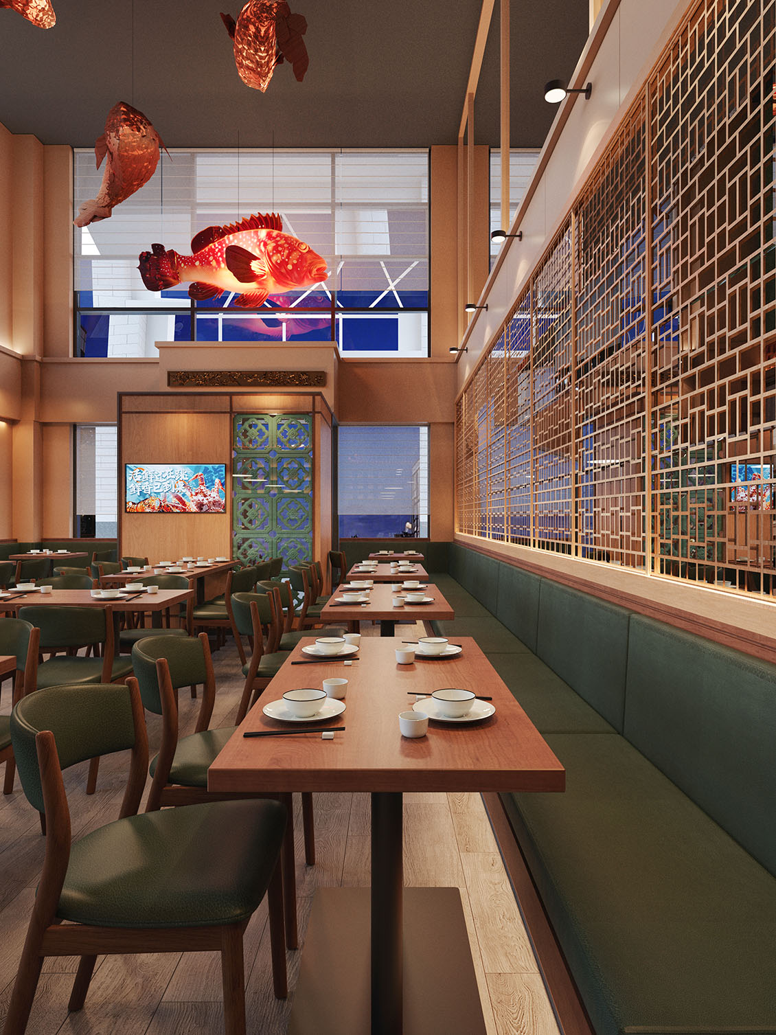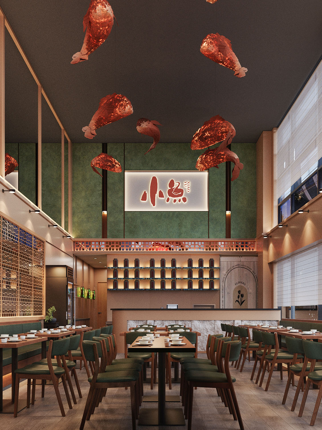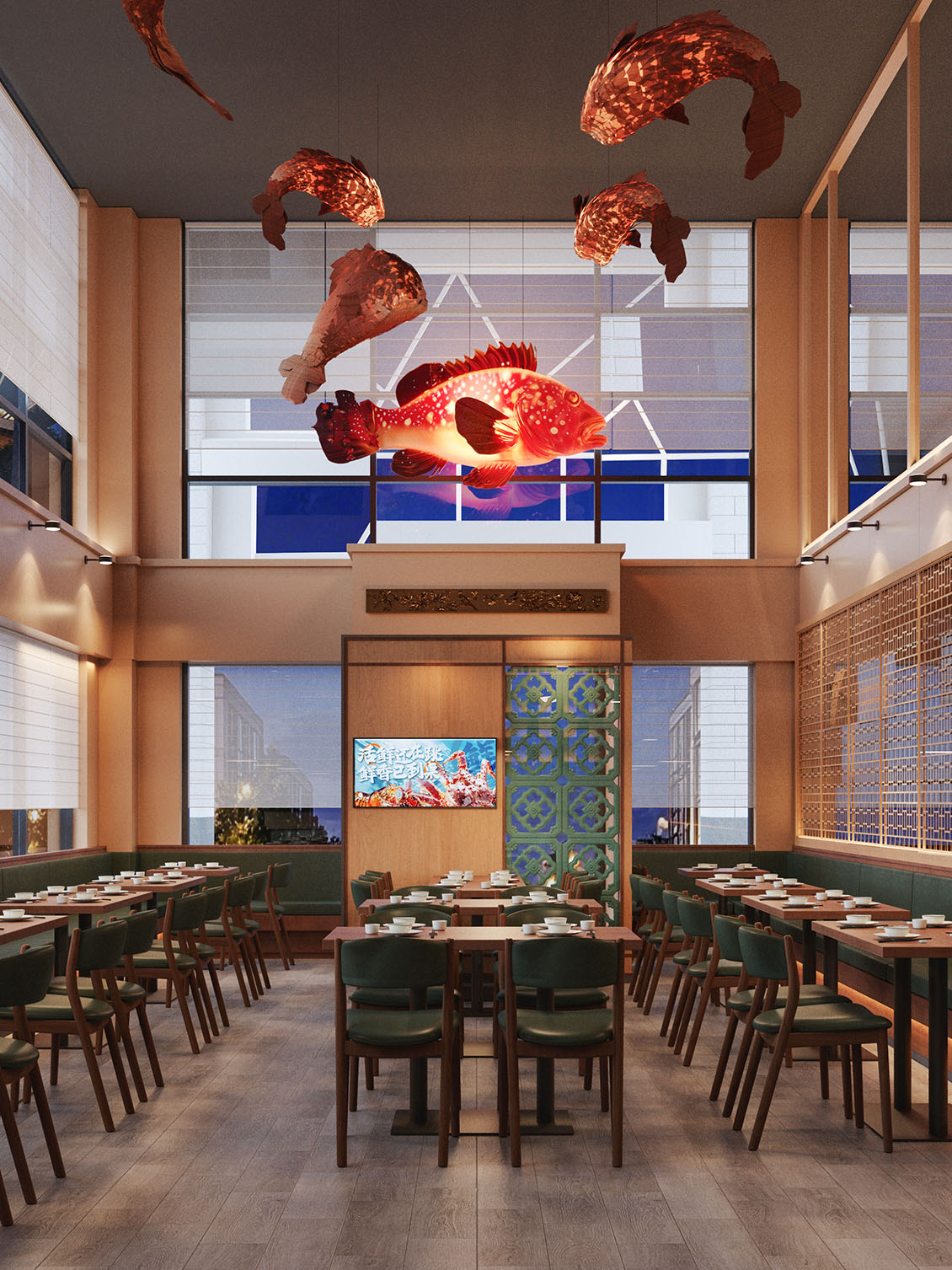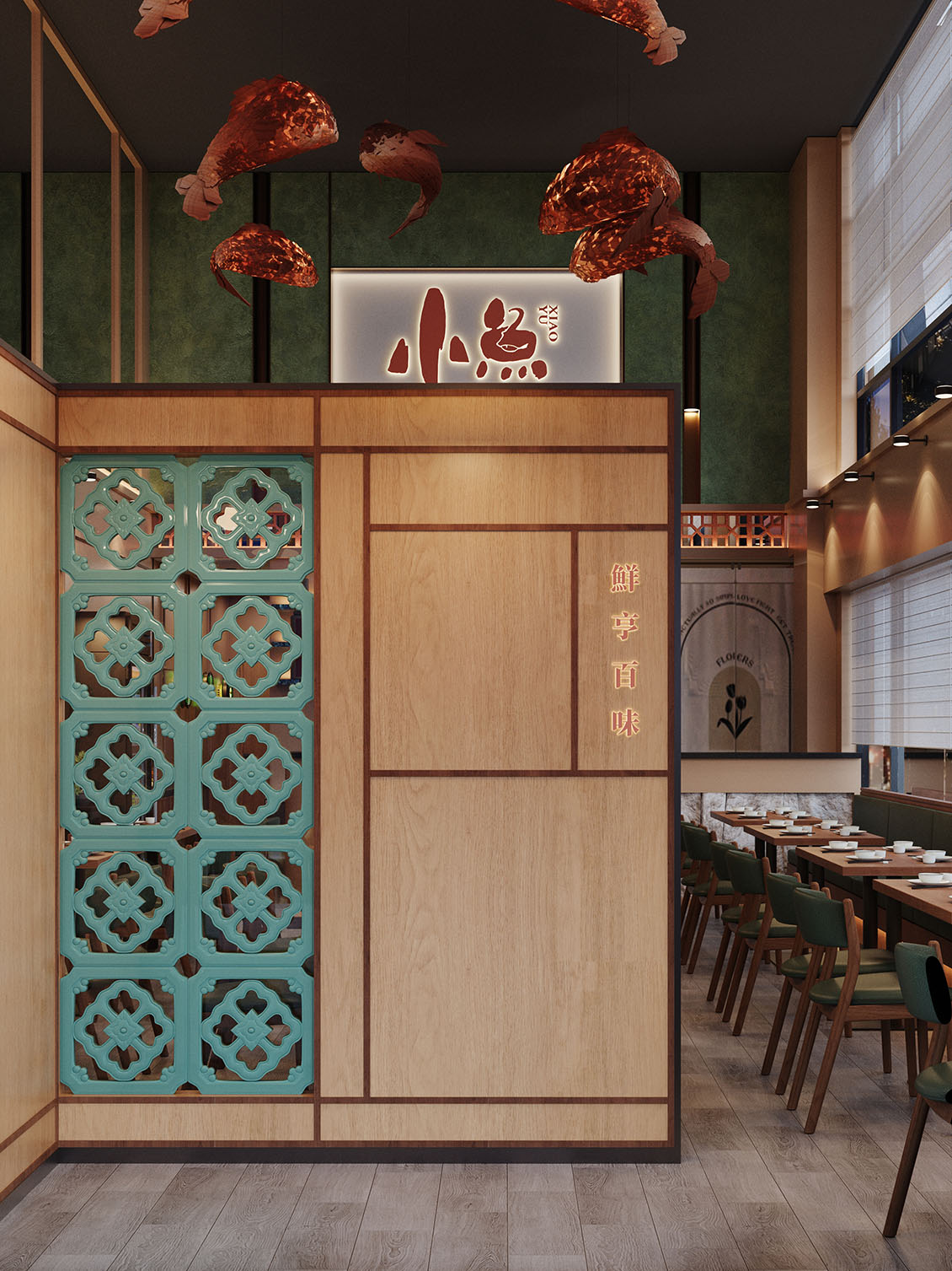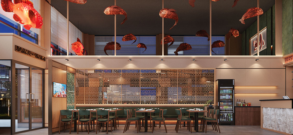 在本案设计过程中,我们想营造一种离海不远的中式惬意。设计以现代手法勾勒东方韵味,艺术漆与PU石皮衬托出粗粝自然的背景,原木与陶土雕花则注入温暖的手作感。绿色鎏金板如暗涌的水光,鱼型灯笼悬垂,呼应“鱼”的主题。