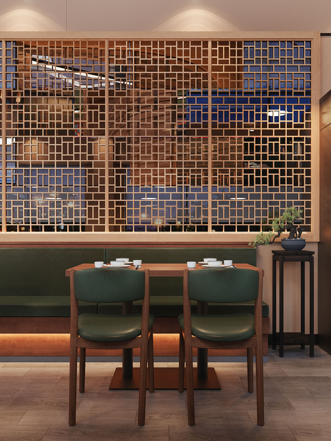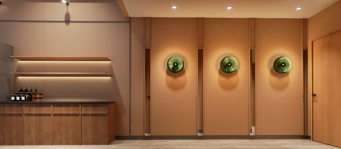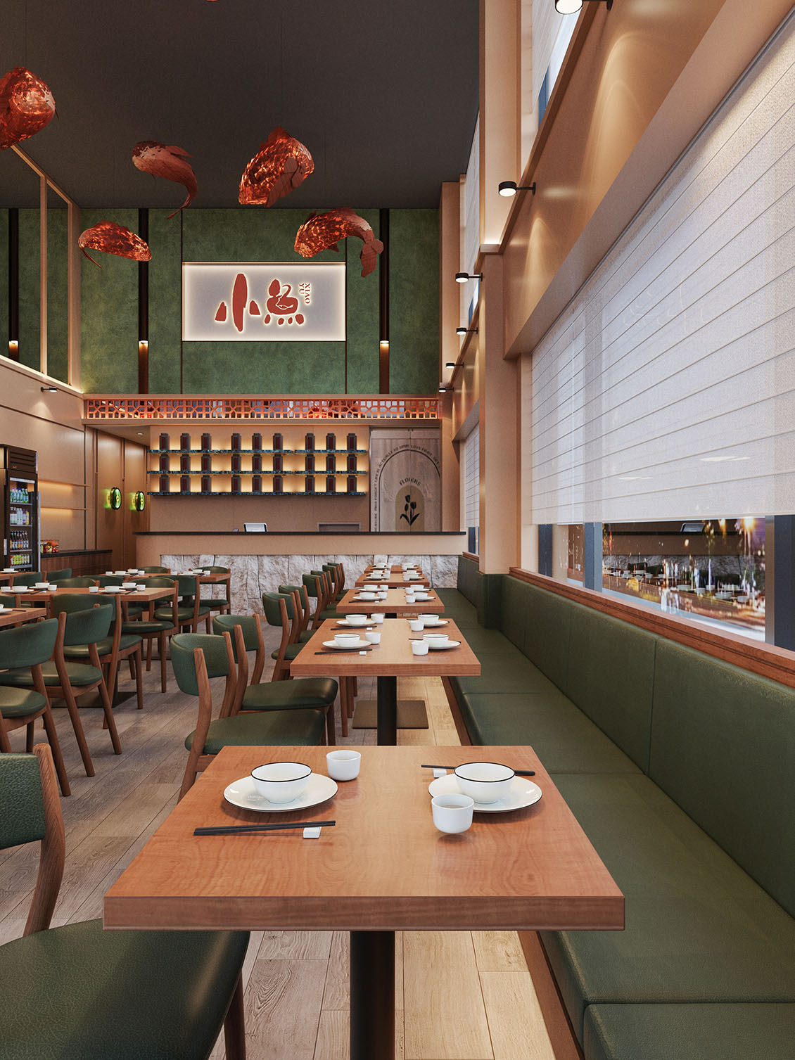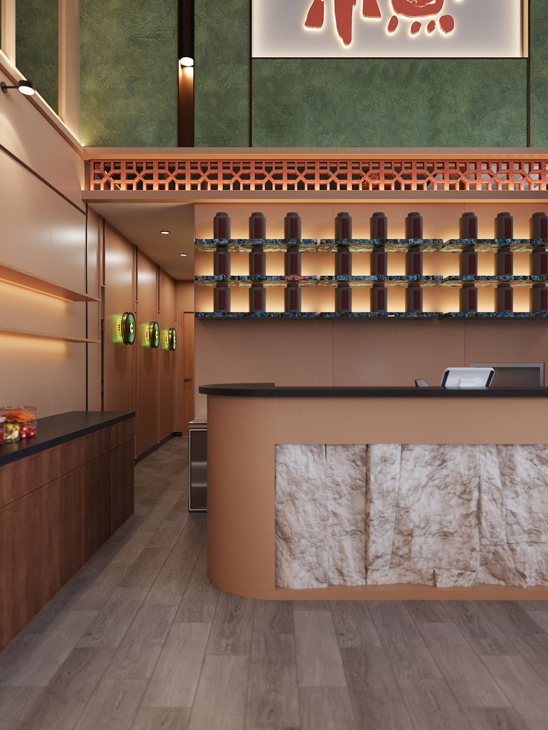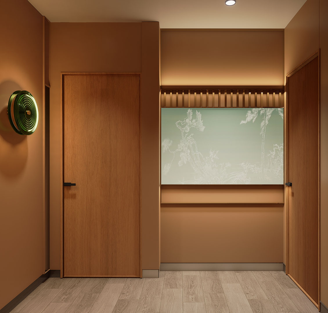 在本案设计过程中,我们想营造一种离海不远的中式惬意。设计以现代手法勾勒东方韵味,艺术漆与PU石皮衬托出粗粝自然的背景,原木与陶土雕花则注入温暖的手作感。绿色鎏金板如暗涌的水光,鱼型灯笼悬垂,呼应“鱼”的主题。